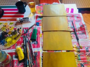 Az alapanyagom viszont sok kicsi farostlapból állt, amit egybe szerettem volna látni, úgyhogy kizártam a fekvős, ölbe festős opciót.